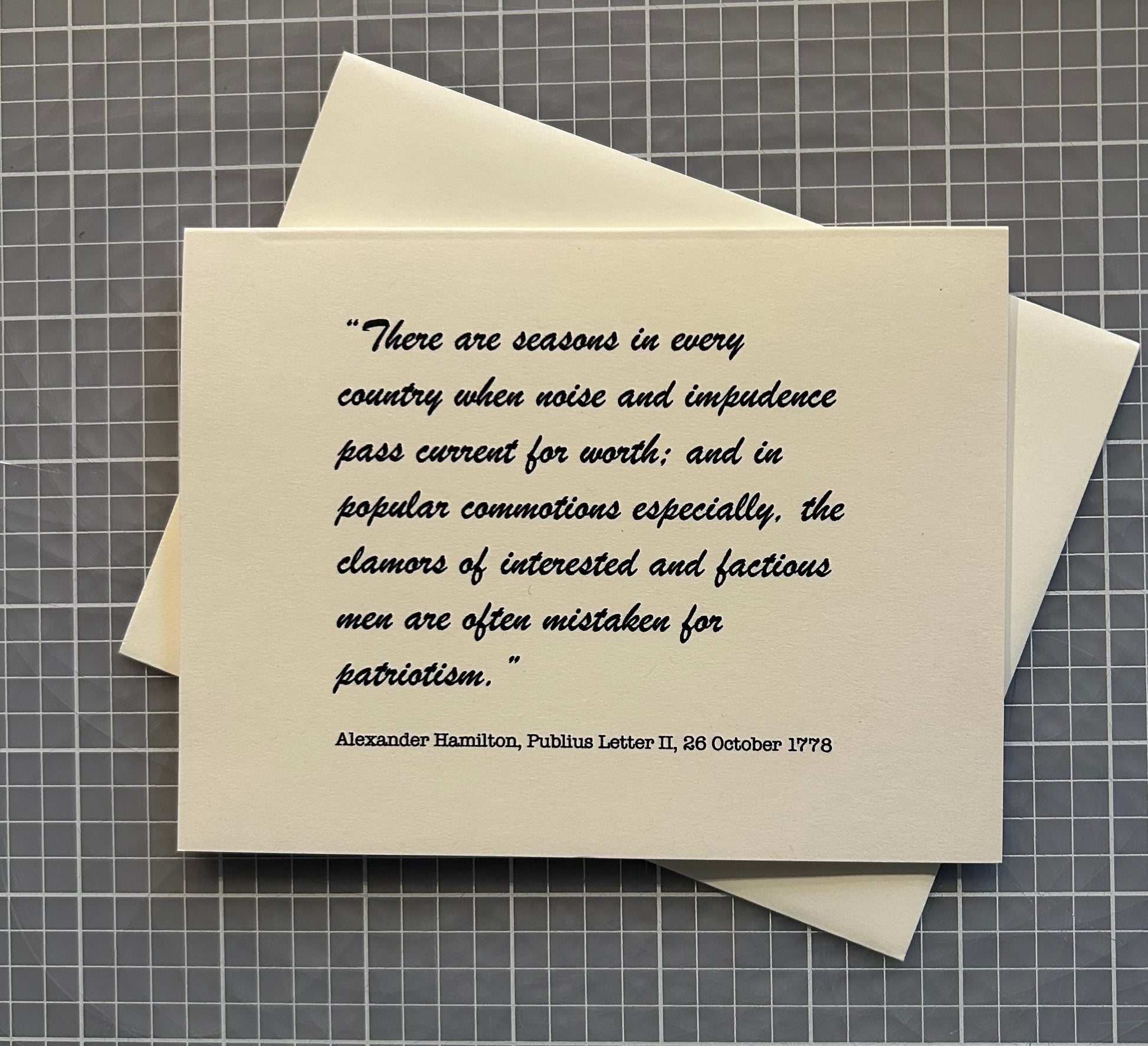 This card has no swearing! A quote from Alexander Hamilton that is still pertinent. "There are seasons in every country, when noise and impudence pass current for worth; and in popular commotions especially, the clamours of interested and factious men are often mistaken for patriotism."