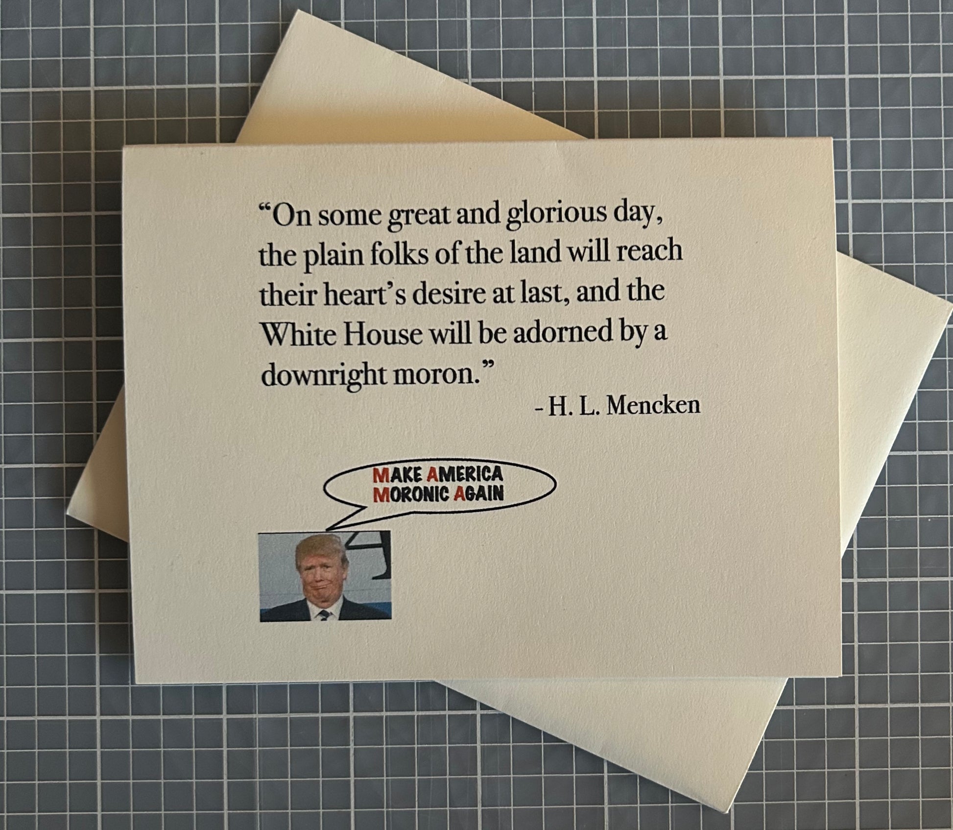 This card has no swearing! A quote from H.L. Mencken that is still pertinent. "On some great and glorious day, the plain folks of the land will reach their heart's desire at last, and the White House will be adorned by a downright moron."